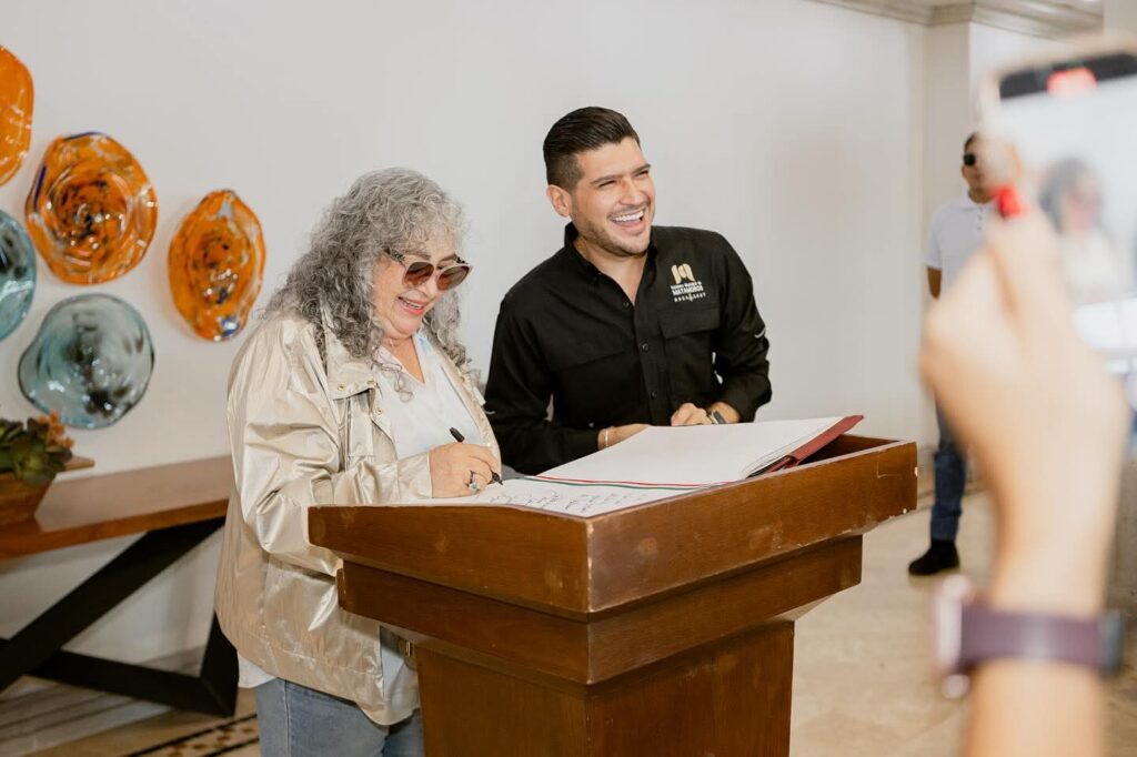 La reconocida cantante Amanda Miguel firmó el Libro de huésped distinguido de Matamoros, gesto con el que expresó su agradecimiento por el cariño y las muestras de afecto recibidas durante su presentación en el cierre del Festival Internacional de Otoño.