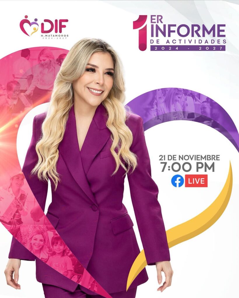 La presidenta del Sistema DIF Matamoros, Ana Ariceaga de Granados, anunció que este viernes 21 de noviembre, a las 7:00 p.m., llevará a cabo la presentación de su Informe de Actividades correspondiente a su primer período al frente del organismo. La ceremonia será transmitida en vivo a través de la página de Facebook de la institución, invitando a la comunidad a acompañar y conocer de cerca los avances y logros alcanzados en beneficio de las familias matamorenses.