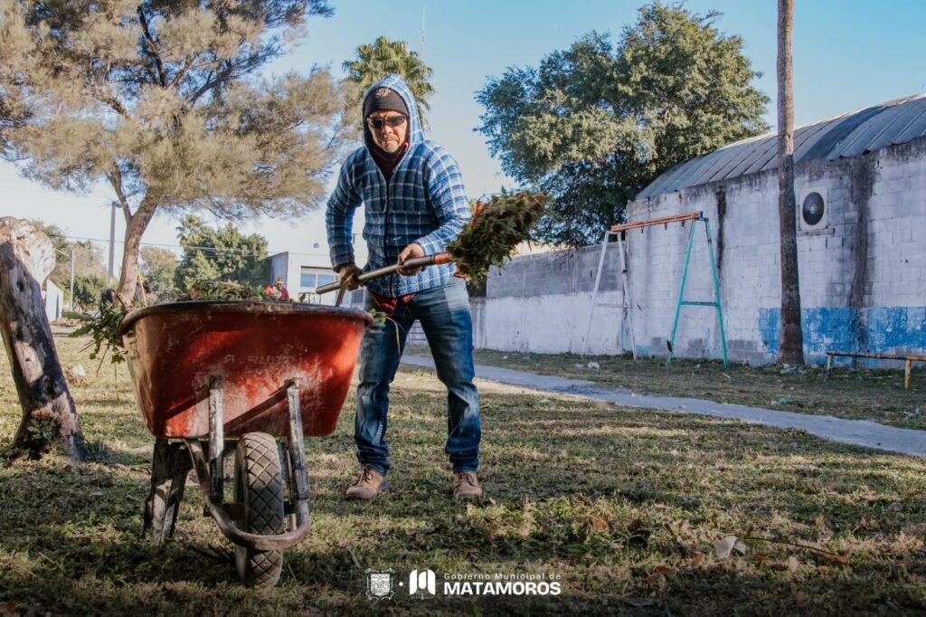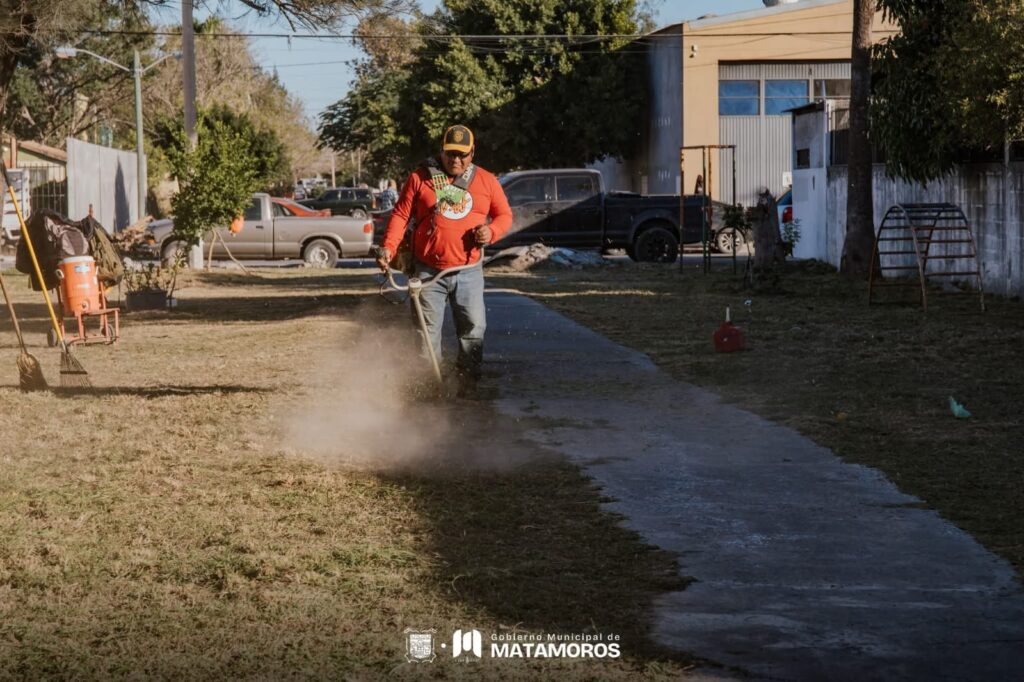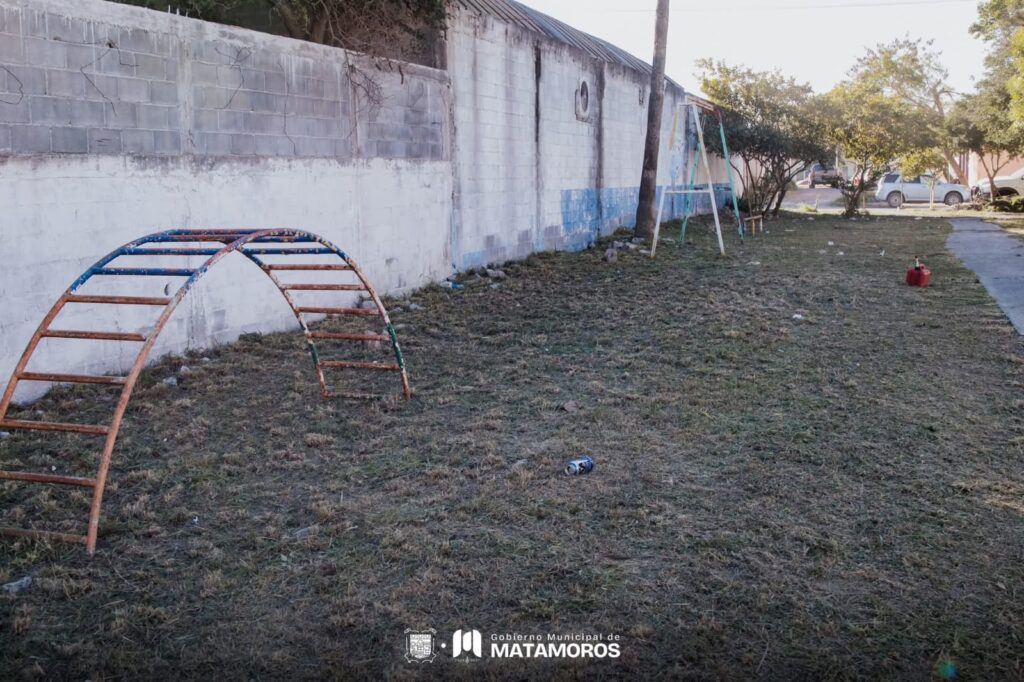 En esta zona se desarrollan labores de limpieza, deshierbe y acondicionamiento del área que rodea los juegos infantiles, con el objetivo de conservar un espacio adecuado para el uso comunitario de niñas, niños y familias, como parte del Renacimiento de Matamoros.