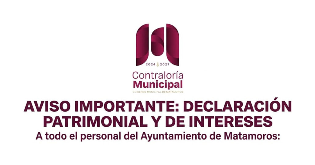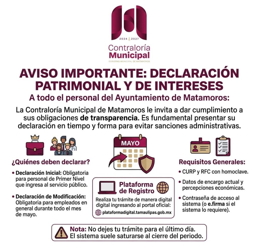 La Contraloría Municipal de Matamoros le invita a dar cumplimiento a sus obligaciones de transparencia. Es fundamental presentar su declaración en tiempo y forma para evitar sanciones administrativas.