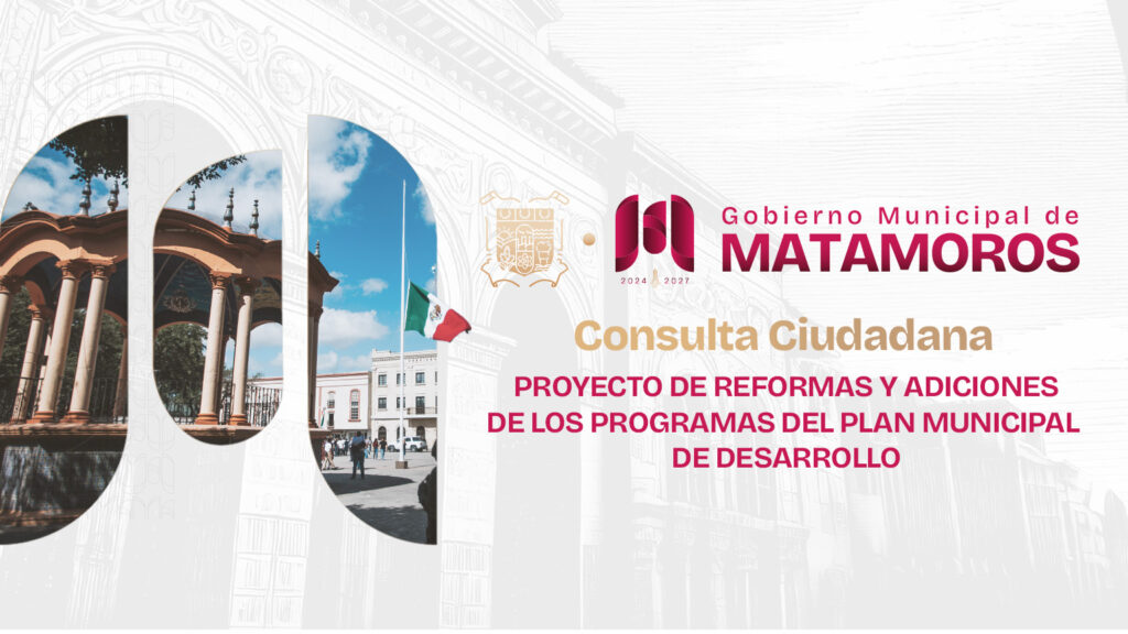 - El Anteproyecto estará a disposición de la ciudadanía para su consulta en el sitio oficial de Internet del Gobierno Municipal de Matamoros www.matamoros.gob.mx, en el banner respectivo a la Consulta Ciudadana para el Anteproyecto de REFORMAS Y ADICIONES DEL PLAN MUNICIPAL DE DESARROLLO DE MATAMOROS, TAMAULIPAS 2024 – 2025 partir del día 01 DE OCTUBRE DE 2025 a las 9:00 horas y hasta el 22 DE OCTUBRE a las 10:00 horas.