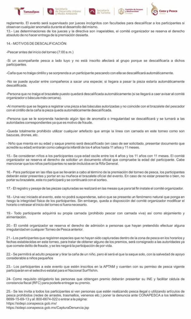 23.- Los participantes a este evento que estén inscritos en la APTAM y cuenten con su permiso de pesca vigente participarán en el selectivo estatal para el Nacional Surf fishing.