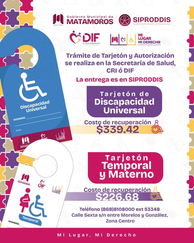 El Gobierno de Matamoros continúa fortaleciendo el renacimiento de Matamoros con acciones que promueven la igualdad de oportunidades y el acceso pleno a los derechos. A través de la Secretaría de Salud, el CRI y el DIF, se invita a las y los ciudadanos a tramitar su Tarjetón de Discapacidad Universal, Temporal o Materno, un documento que garantiza el derecho a la movilidad y contribuye a una ciudad verdaderamente inclusiva.