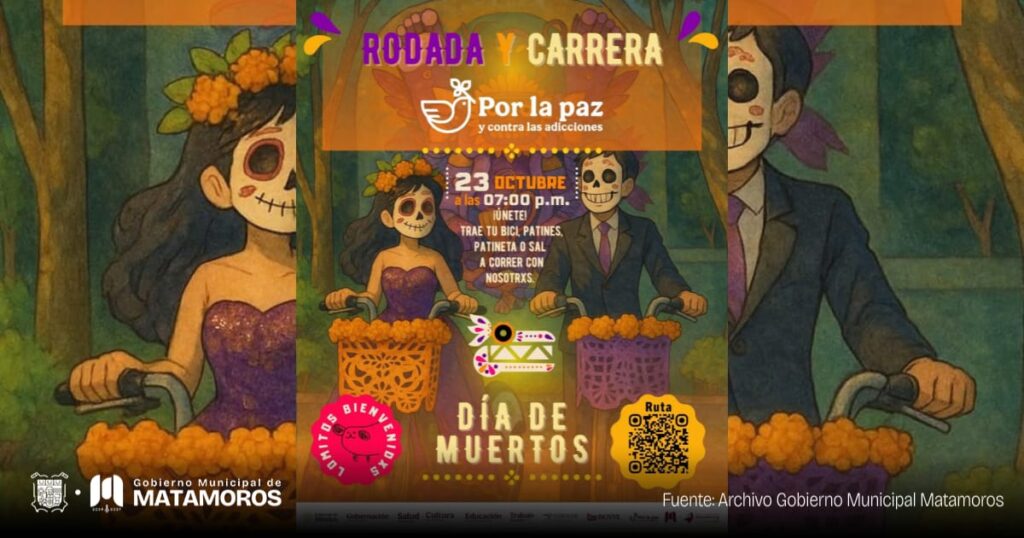 A través del Instituto Municipal de Atención a la Juventud (IMAJ), se invita a todas y todos los matamorenses a participar este miércoles 23 de octubre en una rodada y carrera que partirá del Panteón Antiguo rumbo a la Plaza Principal, en punto de las 7:00 de la tarde. Este recorrido tiene como objetivo incentivar la activación física y reforzar los lazos de comunidad bajo un mensaje de unidad y esperanza.